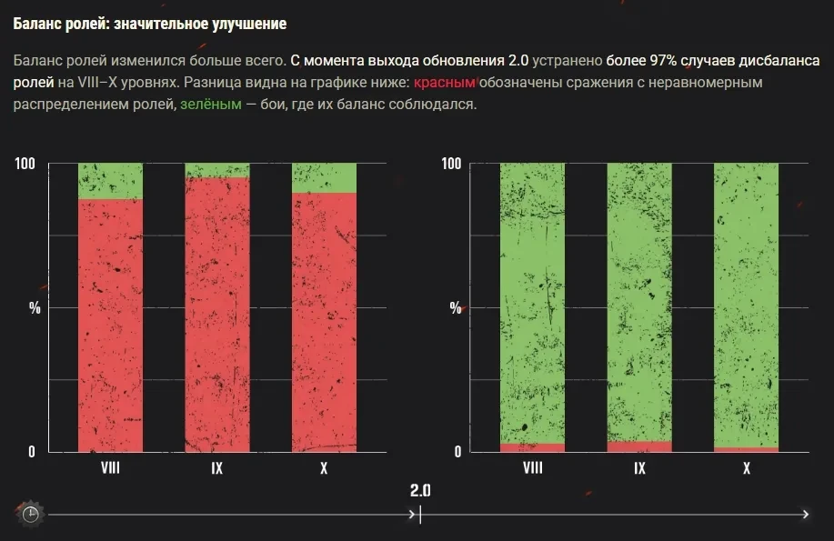 Баланс ролей изменился больше всего. С момента выхода обновления 2.0 устранено более 97% случаев дисбаланса ролей на VIII–X уровнях. Разница видна на графике ниже: красным обозначены сражения с неравномерным распределением ролей, зелёным — бои, где их баланс соблюдался.