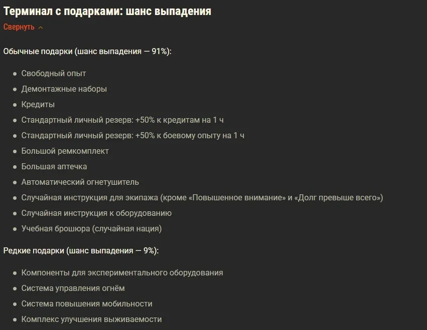 Один жетон гарантирует вам получение одного случайного подарка. А ещё это хорошая возможность заполучить экспериментальное оборудование или компоненты для него!