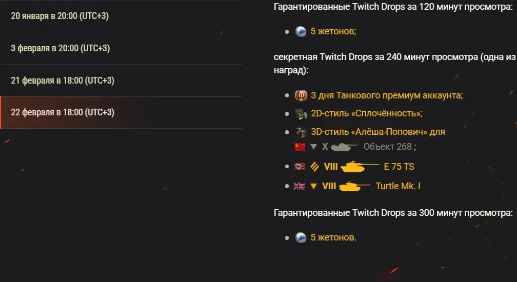 Просмотр каждой из трансляций принесёт вам гарантированные Twitch Drops с жетонами. При этом в рамках некоторых из них можно получить дополнительные награды и секретные Drops. Отмечайте даты в календаре, чтобы ничего не пропустить!