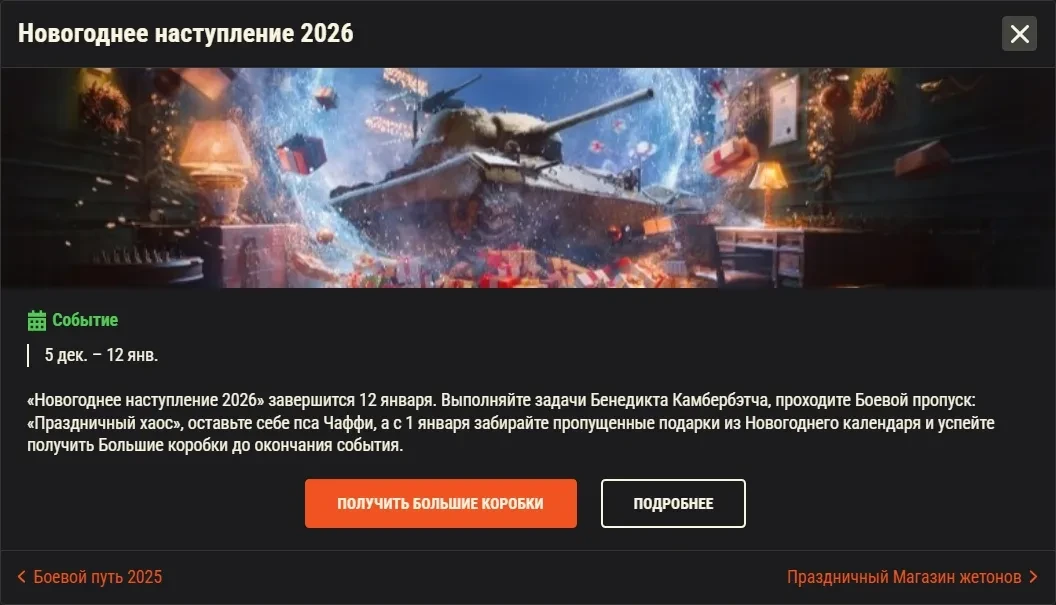 «Новогоднее наступление 2026» завершится 12 января. Выполняйте задачи Бенедикта Камбербэтча, проходите Боевой пропуск: «Праздничный хаос», оставьте себе пса Чаффи, а с 1 января забирайте пропущенные подарки из Новогоднего календаря и успейте получить Большие коробки до окончания события.