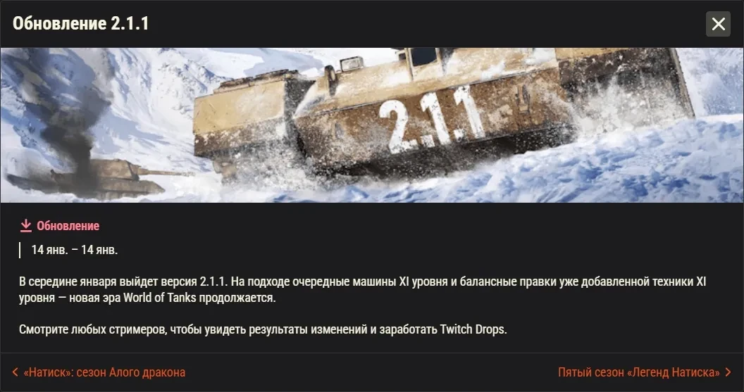 В середине января выйдет версия 2.1.1. На подходе очередные машины XI уровня и балансные правки уже добавленной техники XI уровня — новая эра World of Tanks продолжается.