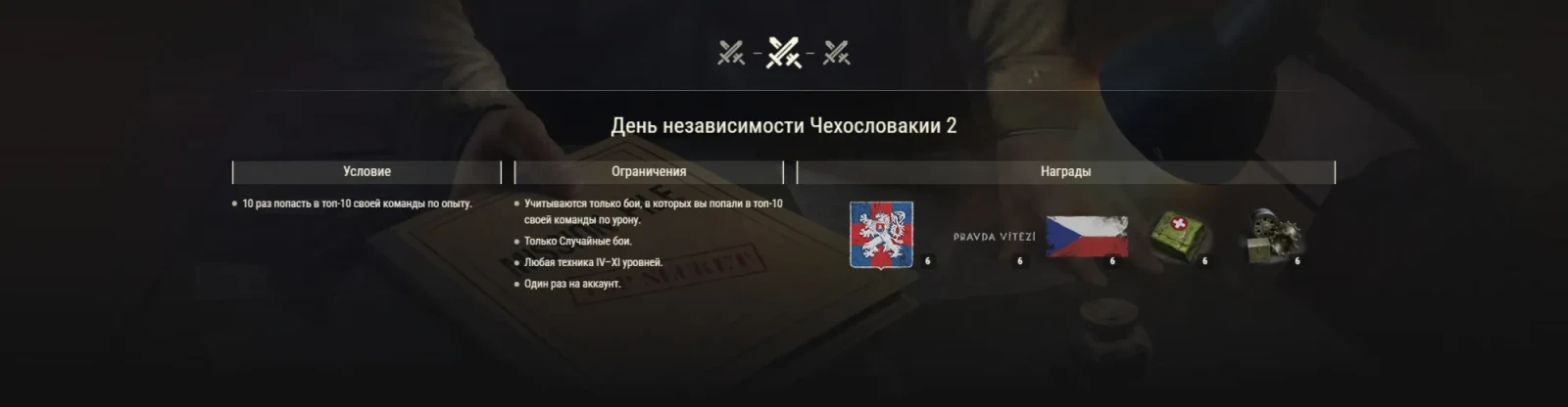 Выполните цепочку боевых задач и заработайте предметы в тематике Чехословакии, личные резервы и другие награды.