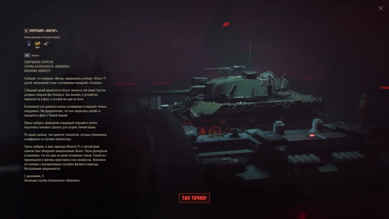 Сообщаю, что операция «Иштар» завершилась успешно. Объект 71 достиг назначенной точки и активировал немецкий «Телепорт».