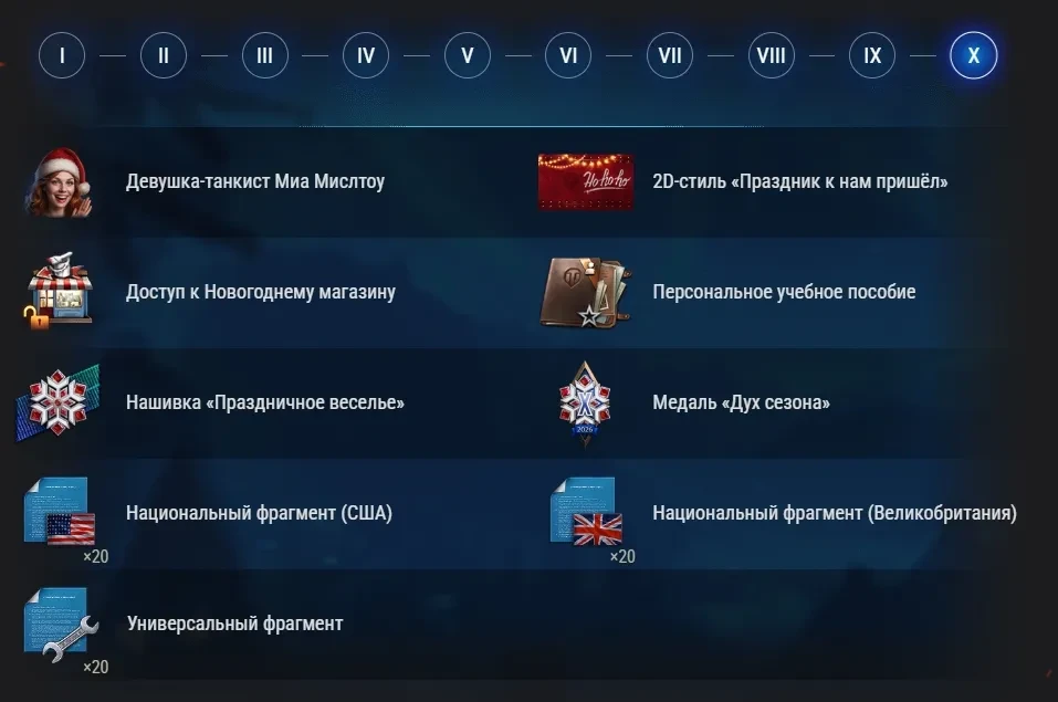 За каждый достигнутый уровень вы получаете награды: от нового праздничного 2D-стиля «Праздник к нам пришёл» и девушек-танкистов до личных резервов, национальных и универсальных фрагментов чертежей и т. д. X уровень атмосферы праздника также даст бонус как для машин X, так и XI уровня — после того, как вы выполните поручения.