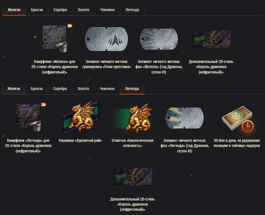 Получите новые сезонные элементы внешнего вида , в т. ч. прогрессионный 2D-стиль «Король драконов (нефритовый)». Этот стиль включает декали, эмблемы, надписи и камуфляжные схемы, которые открываются за ключевые достижения в «Натиске» или получение более высоких рангов.