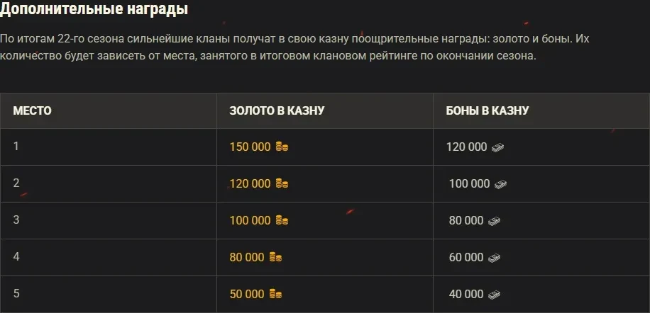 По итогам 22-го сезона сильнейшие кланы получат в свою казну поощрительные награды: золото и боны. Их количество будет зависеть от места, занятого в итоговом клановом рейтинге по окончании сезона.