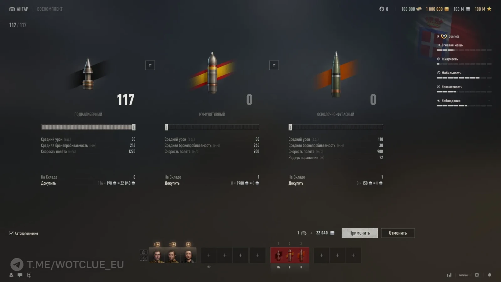 - Начальная скорость полёта Подкалиберного снаряда: 1 270