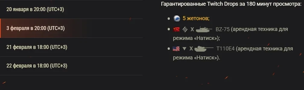 Просмотр каждой из трансляций принесёт вам гарантированные Twitch Drops с жетонами. При этом в рамках некоторых из них можно получить дополнительные награды и секретные Drops. Отмечайте даты в календаре, чтобы ничего не пропустить!