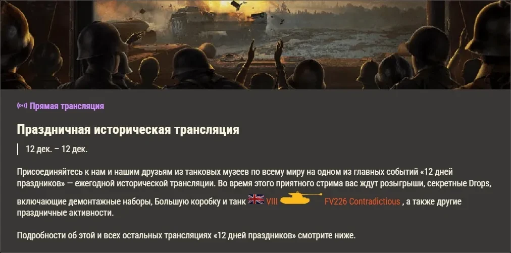 Присоединяйтесь к нам и нашим друзьям из танковых музеев по всему миру на одном из главных событий «12 дней праздников» — ежегодной исторической трансляции. Во время этого приятного стрима вас ждут розыгрыши, секретные Drops, включающие демонтажные наборы, Большую коробку и танк VIII FV226 Contradictious, а также другие праздничные активности.