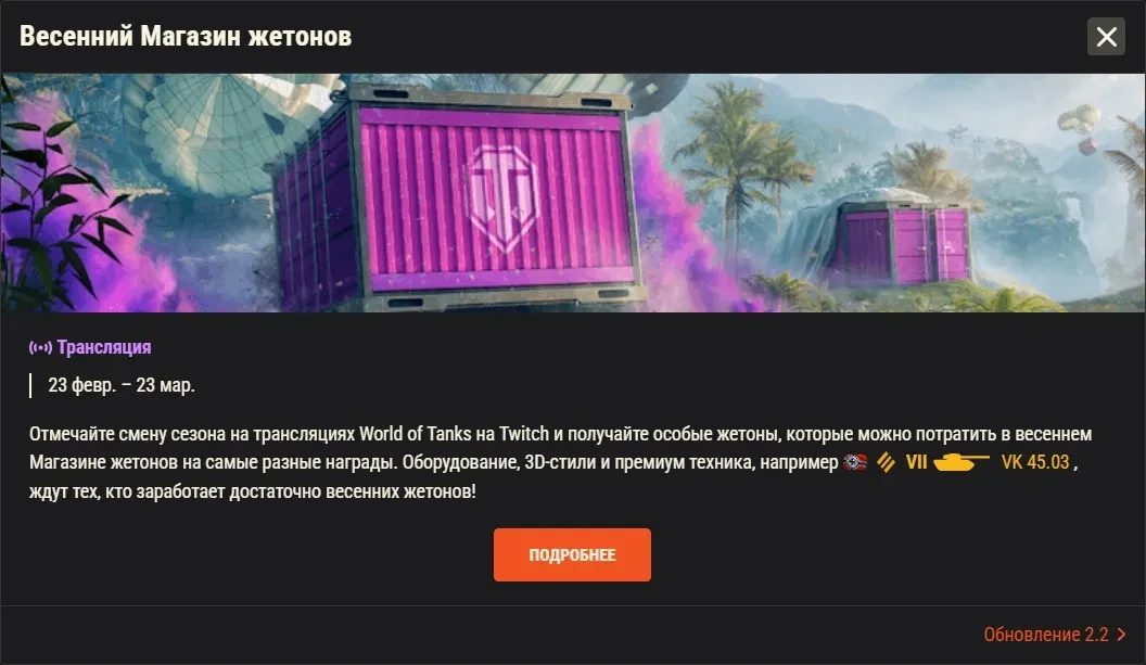 Отмечайте смену сезона на трансляциях World of Tanks на Twitch и получайте особые жетоны, которые можно потратить в весеннем Магазине жетонов на самые разные награды. Оборудование, 3D-стили и премиум техника, например VII VK 45.03, ждут тех, кто заработает достаточно весенних жетонов!