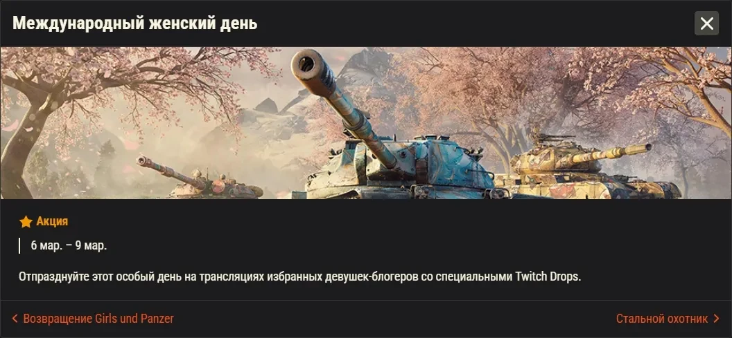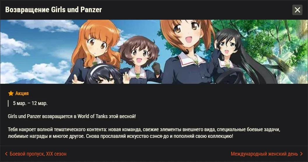 Март в World of Tanks обещает быть богатым на события. Специальная коллаборация с Girls und Panzer, соревновательные режимы, внутриигровые события и возвращение любимой классики — смена сезона принесёт много нового.