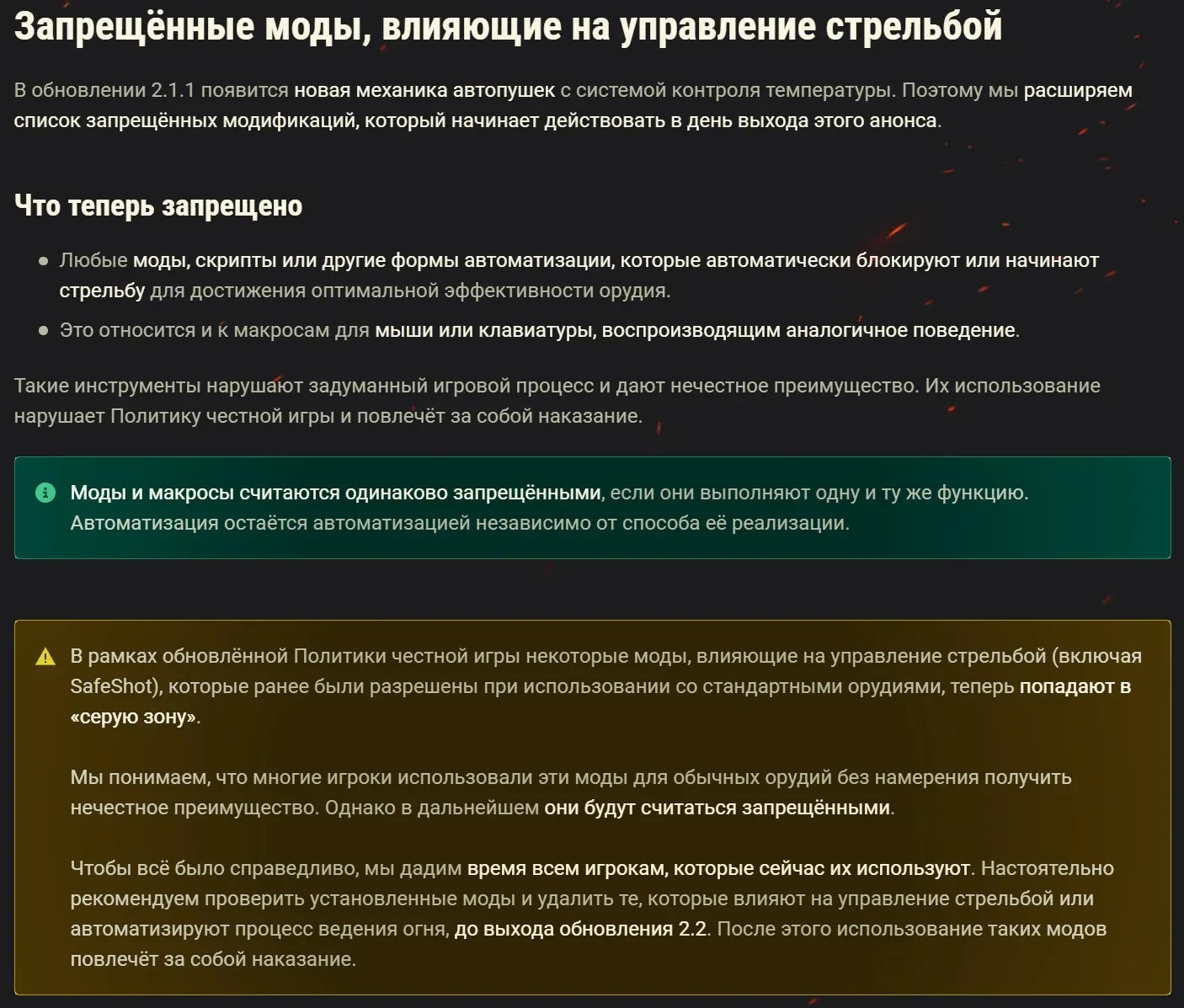 Чтобы всё было справедливо, мы дадим время всем игрокам, которые сейчас их используют. Настоятельно рекомендуем проверить установленные моды и удалить те, которые влияют на управление стрельбой или автоматизируют процесс ведения огня, до выхода обновления 2.2. После этого использование таких модов повлечёт за собой наказание.