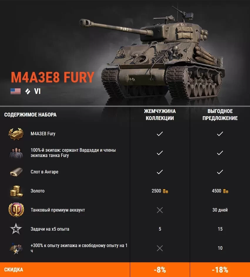 Вариация танка Sherman сержанта Вардэдди дебютировала в игре World of Tanks ещё в 2014 году с выходом блокбастера «Ярость». Знаменитый M4A3E8 Fury отдал должное своим историческим аналогам — трём танкам M4 Sherman под командованием сержанта Пула Лафайета, уничтожившего 270 машин противника всего за 79 дней — тем самым став легендой.