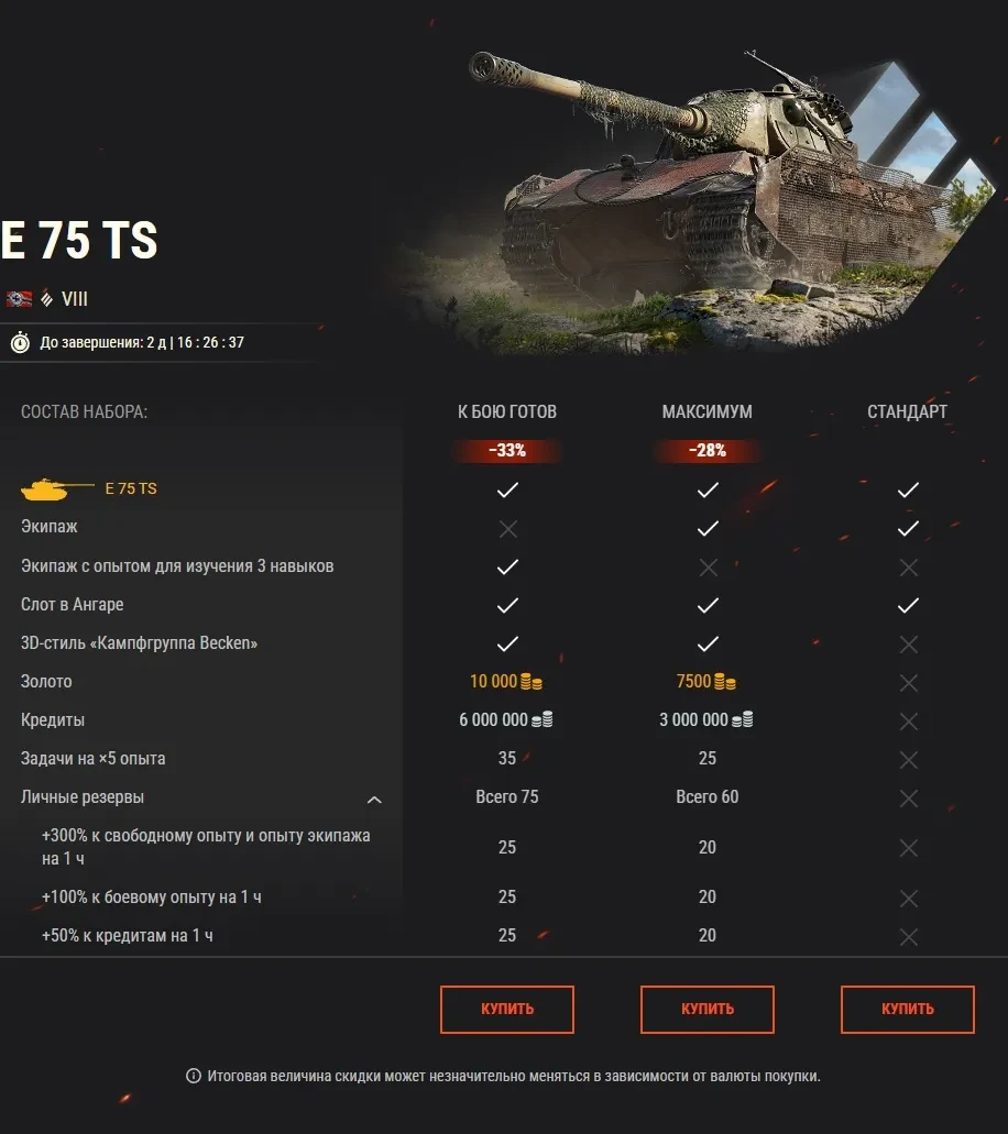 В Премиум магазин вернулись два легендарных танка VIII уровня: VIII Т-44-100 и VIII E 75 TS. Т-44-100 — универсальный средний танк с высоким уроном в минуту, быстрым сведением и отличной подвижностью. Прочная башня и экранированная броня позволяют уверенно держать удар. E 75 TS сочетает разрушительную огневую мощь и крепкую броню. Его характеристики позволят вам вести агрессивную игру и бесстрашно идти на таран. Выбирайте своего железного гиганта и отправляйтесь в бой!