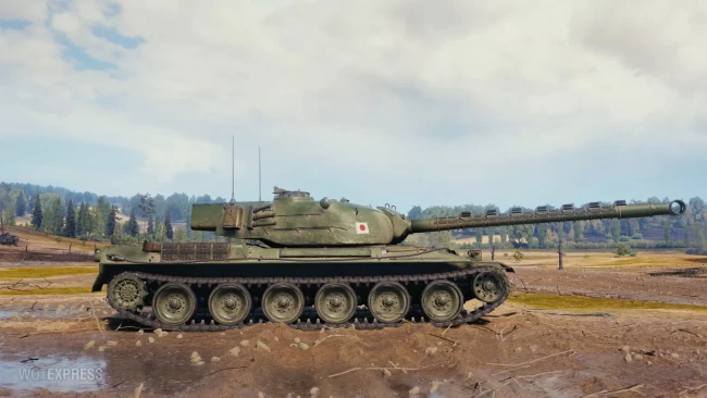 Type 68 (Япония, ТТ-9, прокачиваемый, механики: автоматическая гидропневматическая подвеска, охлаждение орудия) гуляет на природе.