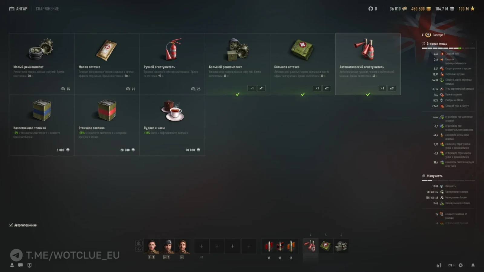 При этом обслуживание танка — экипаж, оборудование, боекомплект и снаряжение — было объединено и теперь располагается на главном экране ангара, под танком. Там же находится и кастомизация.