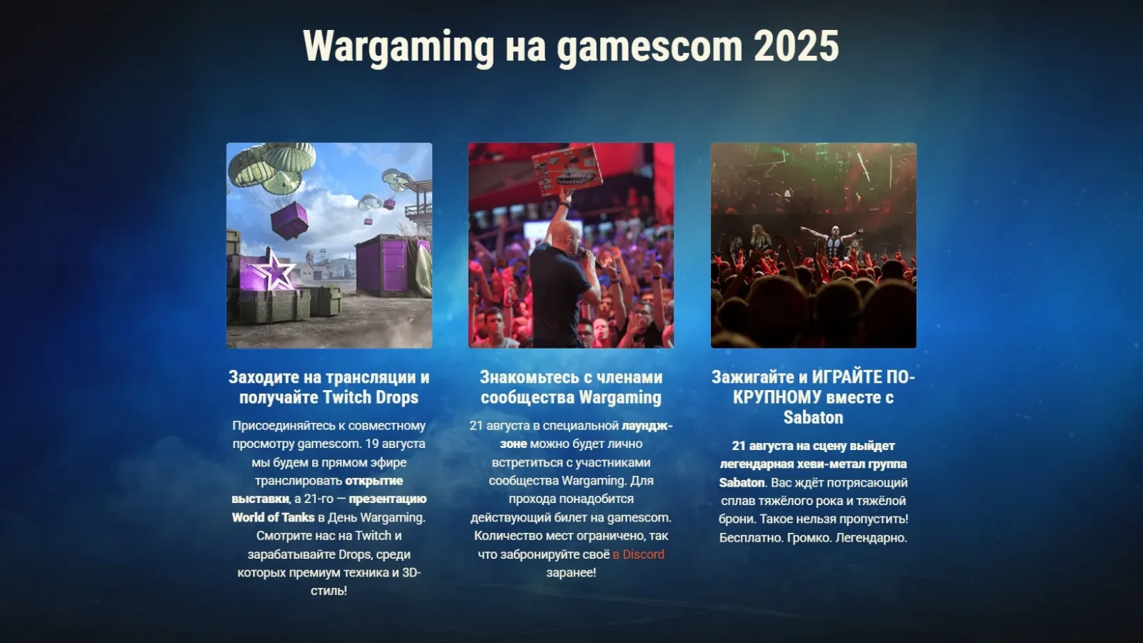 Если вы будете на gamescom, ищите нас 21 августа на Event Arena в Зале 1 под баннером Wargaming PLAY BIG («ИГРАЙ ПО-КРУПНОМУ»). Приходите поздороваться и узнать, что мы покажем на gamescom 2025.