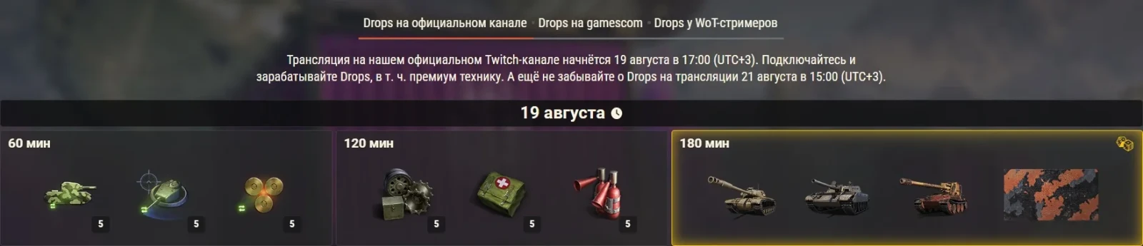 Трансляция на нашем официальном Twitch-канале начнётся 19 августа в 17:00 (UTC+3). Подключайтесь и зарабатывайте Drops, в т. ч. премиум технику. А ещё не забывайте о Drops на трансляции 21 августа в 15:00 (UTC+3).