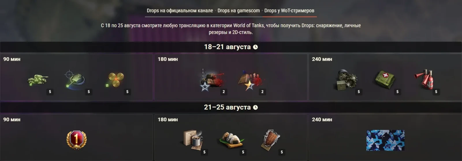 С 18 по 25 августа смотрите любую трансляцию в категории World of Tanks, чтобы получить Drops: снаряжение, личные резервы и 2D-стиль.